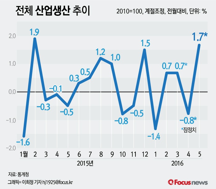 (서울=포커스뉴스) 30일 통계청이 발표한 ‘2016년 5월 산업활동동향’에 따르면 지난 5월 산업생산이 전월대비 1.7%(잠정치) 증가한 것으로 나타났다.