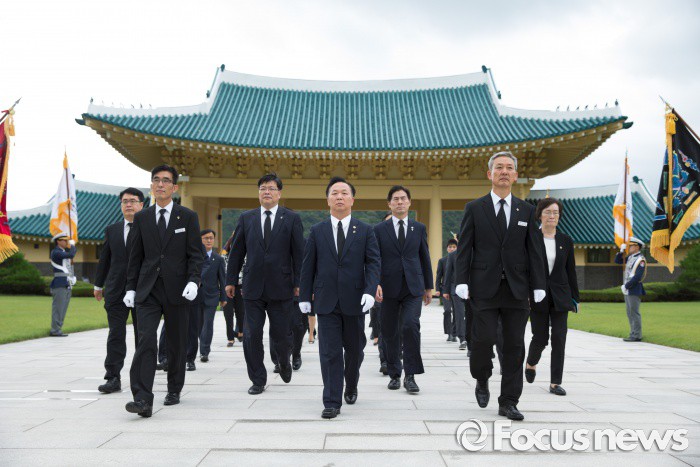 (대전= 포커스뉴스): 30일 오전 김동극(가운데) 신임 인사혁신처장이 간부 공무원들과 함께순국선열과 호국영령을 참배하기 위해 국립대전현충원에 들어서고 있다.<사진제공=인사사혁신처>