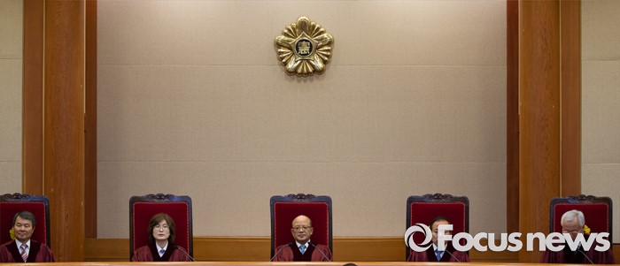 (서울=포커스뉴스) 30일 오후 서울 종로구 헌법재판소 대심판정에서 박한철(가운데) 헌법재판소장이 '언론인 선거운동 금지' 공직선거법 제1항 제5호 위헌법률심판 사건 선고를 위해 착석해 있다.