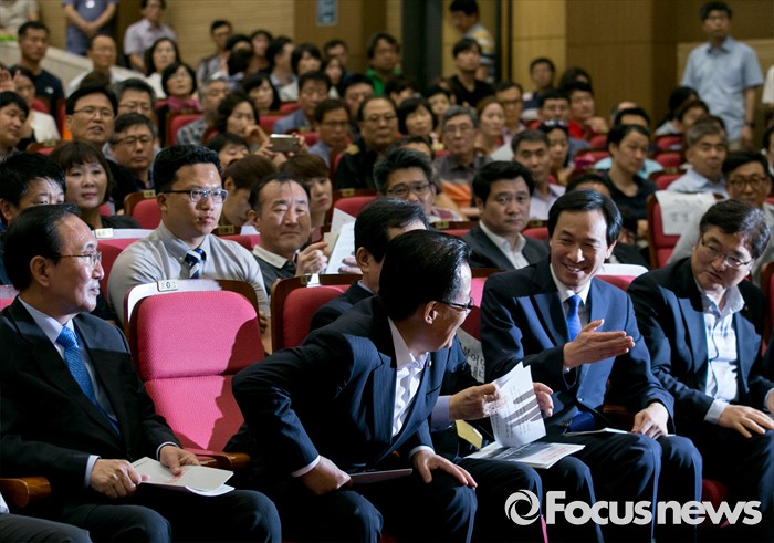 (서울=포커스뉴스) 30일 오후 서울 여의도 국회 의원회관에서 열린 전국가맹점주 피해사례 발표 및 관련법 개정촉구 대회에 참석한 우상호(오른쪽 두번째) 더불어민주당 원내대표가 박지원(왼쪽 두번째) 국민의당 원내대표에게 먼저 축사를 권하고 있다. 왼쪽 첫번째는 노회찬 정의당 원내대표.