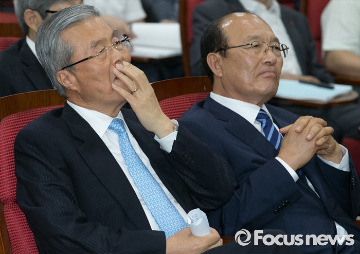 (서울=포커스뉴스) 30일 오후 서울 여의도 국회 의원회관에서 열린 더불어민주당 건강보험 부과체계 개편안 공청회에 참석한 김종인(왼쪽) 비대위 대표와 김종대 정책위부의장이 생각에 잠겨 있다.