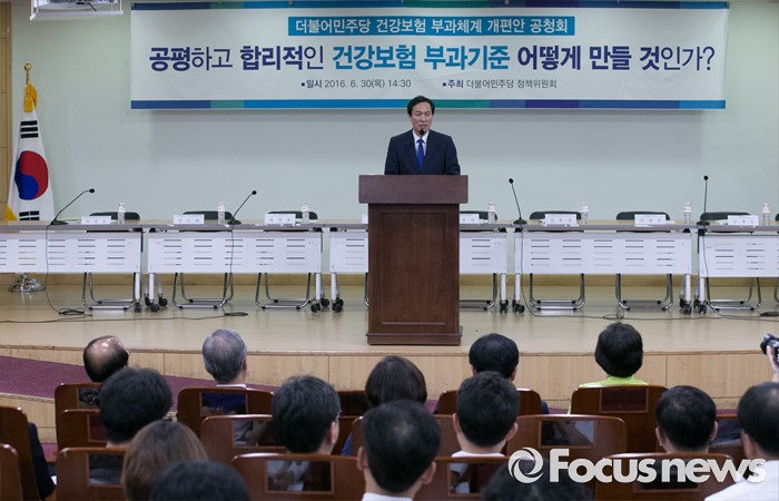 (서울=포커스뉴스) 30일 오후 서울 여의도 국회 의원회관에서 열린 더불어민주당 건강보험 부과체계 개편안 공청회에 참석한 우상호 원내대표가 축사를 하고 있다.