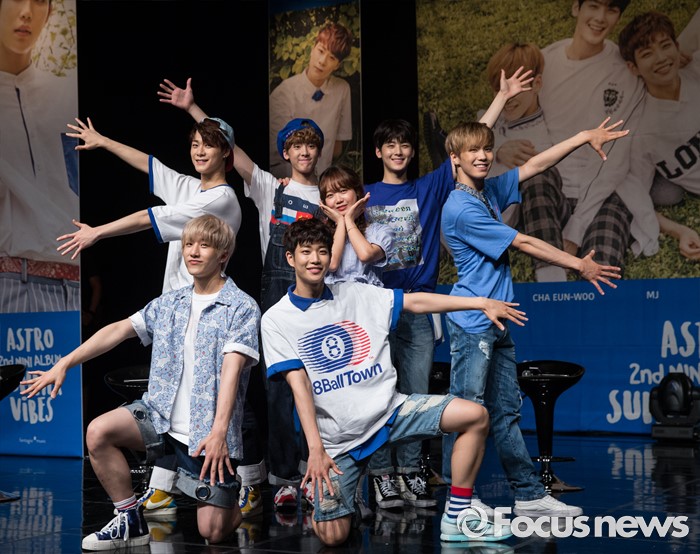 (서울=포커스뉴스) 30일 오후 서울 강남구 일지아트홀에서 열린 아이돌 그룹 아스트로의 두번째 미니앨범 'Summer Vibes' 발표 쇼케이스에 참여한 걸그룹 IOI의 멤버 최유정(사진 가운데)과 아스트로 멤버들이 포토타임을 갖고 있다.