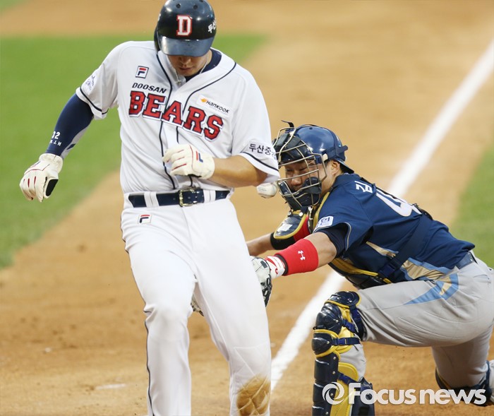 (서울=포커스뉴스) 30일 서울 잠실구장에서 열린 2016 프로야구 NC-두산 경기 2회말 2사 1,2루에서 두산 허경민의 좌전 안타때 2루주자 김재환이 홈까지 뛰어 세이프되고 있다.