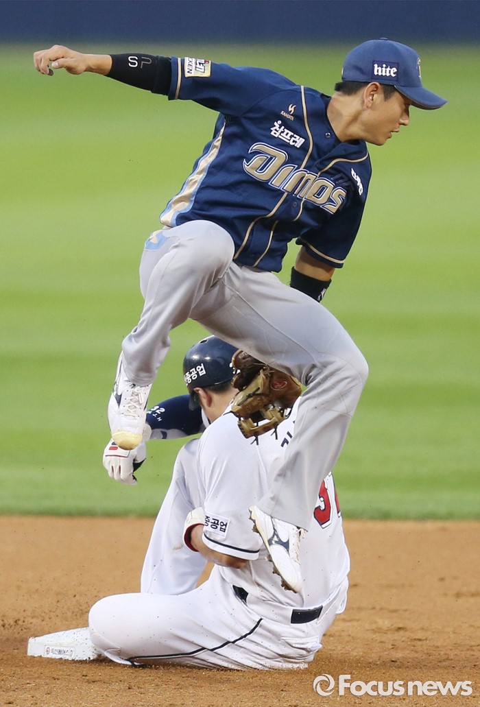 (서울=포커스뉴스) 30일 서울 잠실구장에서 열린 2016 프로야구 NC-두산 경기 2회말 2사 1루에서 두산 1루주자 김재환이 2루 도루를 시도해 세이프되고 있다. NC 유격수 손시헌이 뒤늦은 태그를 하고 있다.
