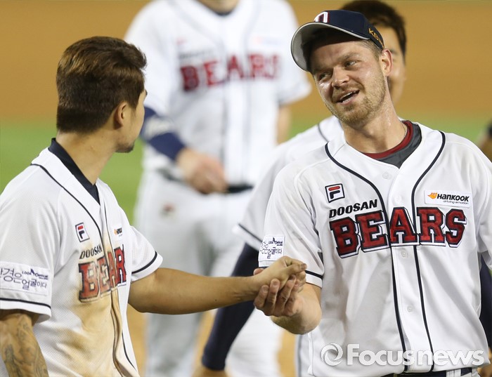 (서울=포커스뉴스) 30일 서울 잠실구장에서 열린 2016 프로야구 NC-두산 경기에서 두산 투수 보우덴이 9이닝 동안 139구를 던지며 KBO리그 역대 13번째 노히트노런을 달성하며 시즌 10승 고지에 올랐다. 오재원과 손을 잡으며 기쁨을 나누고 있다.