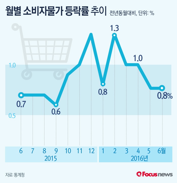 (서울=포커스뉴스) 1일 통계청이 발표한 ‘6월 소비자물가 동향’에 따르면 지난달 소비자물가지수는 110.67로 전년 동월보다 0.8% 증가한 데 그쳤다. 이는 전달 0.8%에 이어 두 달째 같은 수준이다.