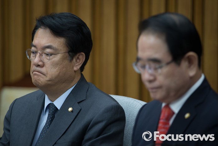 (서울=포커스뉴스) 정진석(왼쪽) 새누리당 원내대표와 박명재 사무총장이 1일 오전 서울 여의도 국회에서 열린 원내대책회의에 참석하고 있다.