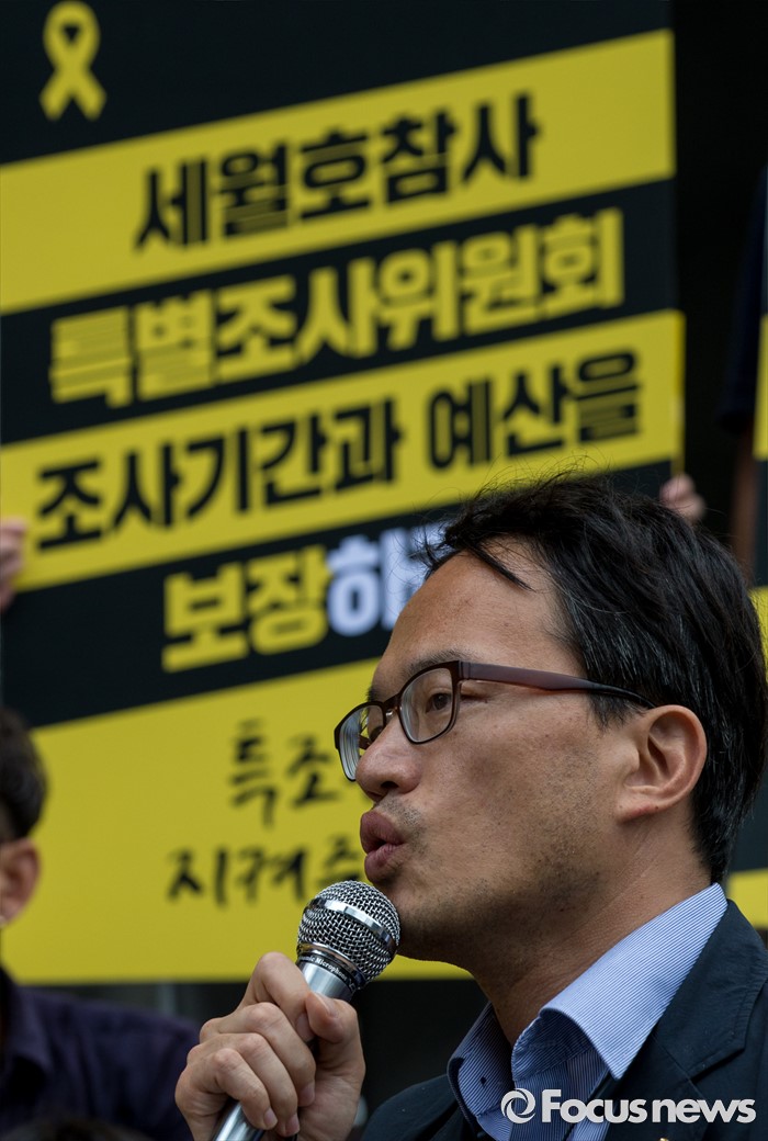 (서울=포커스뉴스) 1일 오전 서울 중구 나라키움저동빌딩 앞에서 열린 '세월호 특조위 성역없는 진상규명 조사 지속 지지 기자회견'에 참석한 박주민 더불어민주당 의원이 특조위 활동 보장을 요구하는 발언을 하고 있다.