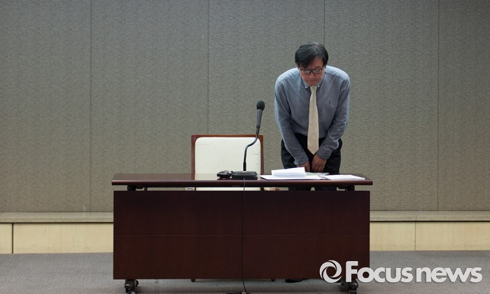 (서울=포커스뉴스) 이동열 투씨엠 대표가 1일 오전 서울 중구 프레스센터에서 열린 제2롯데월드 입면 표절의혹 기자회견에 참석해 취재진을 향해 인사하고 있다. 이 대표는 자사 디자인 '스타 컬렉션'을 45도 회전하면 제2롯데월드 에비뉴엘관의 디자인과 일치한다고 주장했다.