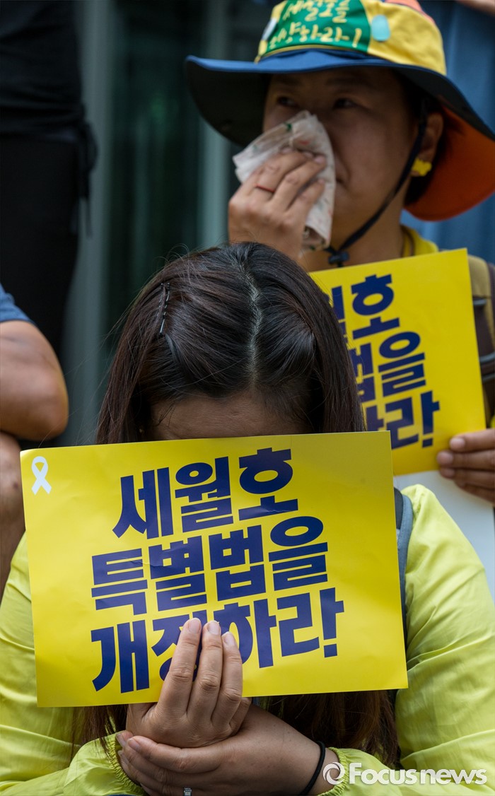 (서울=포커스뉴스) 1일 오전 서울 중구 나라키움저동빌딩 앞에서 열린 '세월호 특조위 성역없는 진상규명 조사 지속 지지 기자회견'에 참석한 416가족협의회와 4.16연대 회원들이 세월호 특별법 개정을 요구하는 손팻말을 들고 있다.