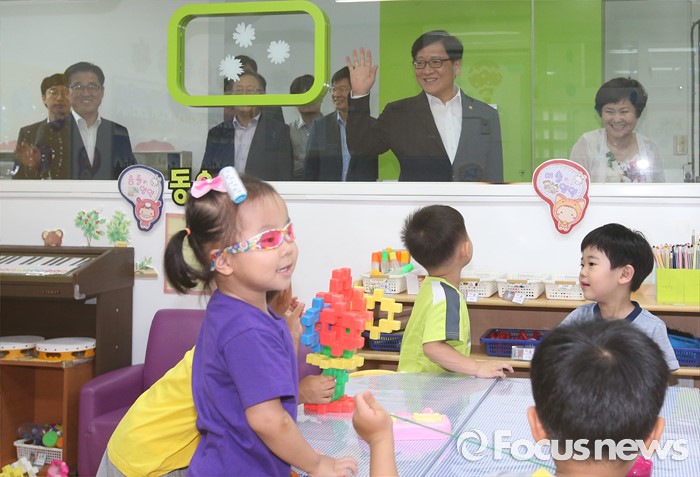 (서울=포커스뉴스) 어린이집을 종일반과 맞춤반으로 나눈 맞춤형 보육 제도가 시행된 1일 서울 성동구 신영창의어린이집을 방문한 정진엽 보건복지부 장관이 원아들과 인사하고 있다.