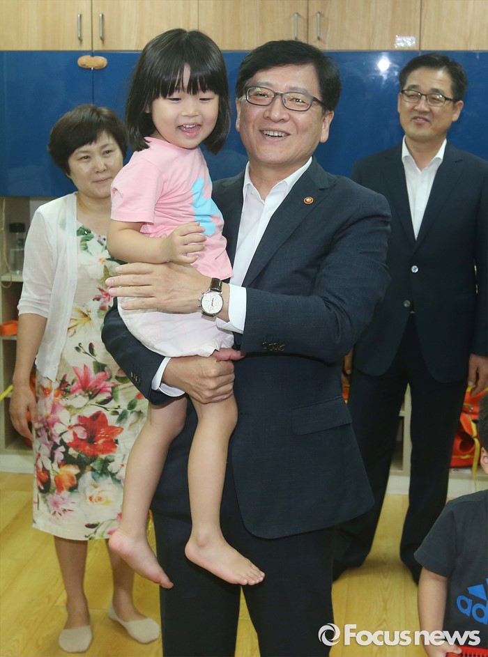 (서울=포커스뉴스) 어린이집을 종일반과 맞춤반으로 나눈 맞춤형 보육 제도가 시행된 1일 서울 성동구 신영창의어린이집을 방문한 정진엽 보건복지부 장관이 한 원아를 안아주고 있다.