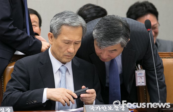 (서울=포커스뉴스) 1일 오후 서울 여의도 국회에서 열린 운영위원회 전체회의에 참석한 김관진(왼쪽) 국가안보실장과 조태용 국가안보실 1차장이 대화하고 있다.