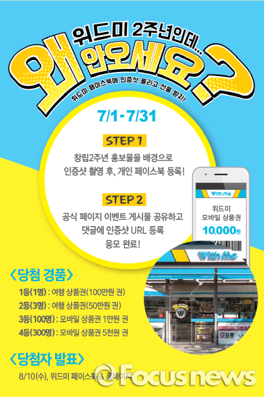 이외에도 위드미 점포에 부착된 창립 2주년 홍보물을 배경으로 촬영한 인증샷을 개인 페이스북에 등록한 뒤 위드미 이벤트 게시글 댓글로 인증샷 URL을 남기면 추첨을 통해 여행 상품권, 위드미 모바일 상품권 등 푸짐한 경품을 지급한다.