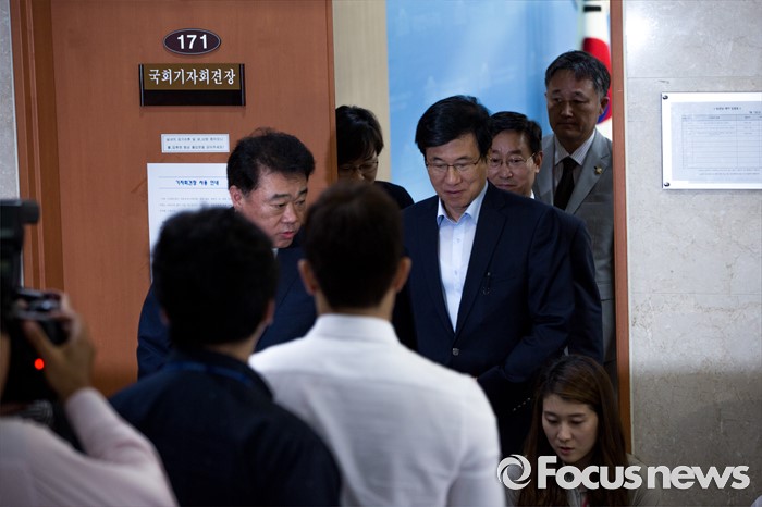 (서울=포커스뉴스) 1일 오후 서울 여의도 국회에서 더불어민주당 공정언론 특위 민주주의회복TF 소속 의원 및 국회 미래창조과학방송통신위원회 소속 의원들이 이정현 새누리당 의원의 청와대 홍보수석 재임시 KBS 보도 개입과 관련한 브리핑을 마친 뒤 기자회견장을 나서고 있다.