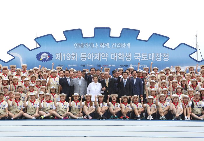 한편, 박카스와 함께하는 ‘동아제약 대학생 국토대장정’ 행사는 1998년에 처음 선보여 올해로 19회를 맞이 했으며, 끝까지 포기하지 않는 젊은이들의 뜨거운 도전과 열정을 상징하는 문화코드로 자리매김 한 동아제약의 대표적인 사회공헌 프로그램이다.박카스와 함께하는 '제19회 동아제약 대학색 국토대장정' 출정식에서 행사관계자들과 참가대원들이 함께 기념촬영을 하고 있다. 두번째줄 좌측부터 동아제약 이원희 사장, JC 특우회 이남석 전회장, 김남조 시인, 동아쏘시오그룹 강신호 회장, 동아쏘시오홀딩스 박찬일 사장, JC 특우회 김현상 전회장. <사진출처=동아제약>