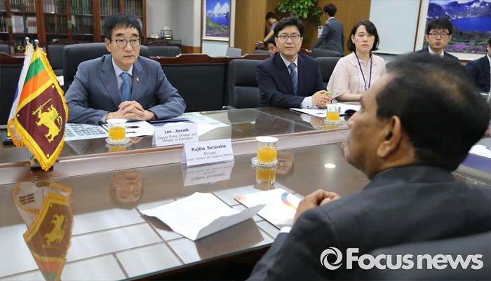 (세종=포커스뉴스) 이준식 사회부총리 겸 교육부장관이 1일 오후 세종시 정부세종청사 교육부 접견실에서 라지따 세나라트너(Rajitha Senaratne) 스리랑카 보건부 장관과 양국의 보건의료분야 교육협력방안을 논의하고 있다.