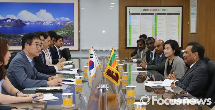 (세종=포커스뉴스) 이준식 사회부총리 겸 교육부장관이 1일 오후 세종시 정부세종청사 교육부 접견실에서 라지따 세나라트너(Rajitha Senaratne) 스리랑카 보건부 장관과 양국의 보건의료분야 교육협력방안을 논의하고 있다.
