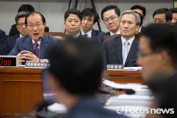 (서울=포커스뉴스) 이원종(왼쪽) 대통령비서실장이 1일 오후 국회에서 열린 운영위원회 전체회의에 참석해 의원들의 질의에 답하고 있다.