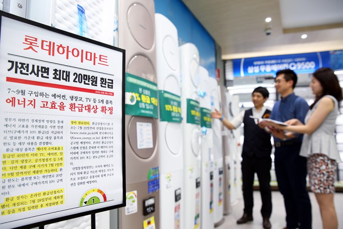 앞서 산업통상자원부는 친환경 소비를 촉진하고자 에어컨, 냉장고, 김치냉장고, TV, 공기청정기 등 가전 5종 가운데 에너지소비효율 1등급 제품을 구매하면 구매금액의 최대 10%를 환급해주겠다는 방침을 밝힌 바 있다.