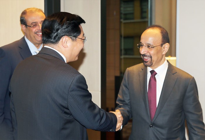 (서울=포커스뉴스) 주형환 산업통상자원부 장관이 1일 서울 광화문 포시즌호텔 미팅룸에서 칼리드 알-팔리(Khalid A. Al-Falih) 사우디아라비아 에너지산업광물부 장관과 면담에 앞서 악수를 하고 있다. <사진제공=산업통상자원부>