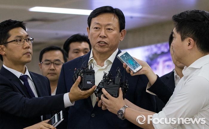 (서울=포커스뉴스) 신동빈 롯데그룹 회장이 3일 오후 서울김포공항을 통해 귀국, 취재진의 질문에 답하고 있다. 신 회장은 이날 기자들에게 최근 롯데그룹을 둘러싼 일련의 사태에 대해 "죄송하다"고 공식 사과 했다.