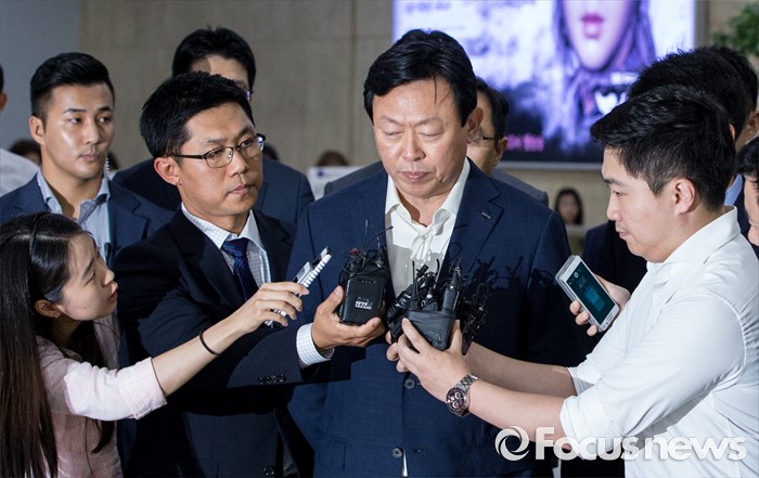 (서울=포커스뉴스) 신동빈 롯데그룹 회장이 3일 오후 서울김포공항을 통해 귀국, 취재진의 질문에 답하고 있다. 신 회장은 이날 기자들에게 최근 롯데그룹을 둘러싼 일련의 사태에 대해 "죄송하다"고 공식 사과 했다.