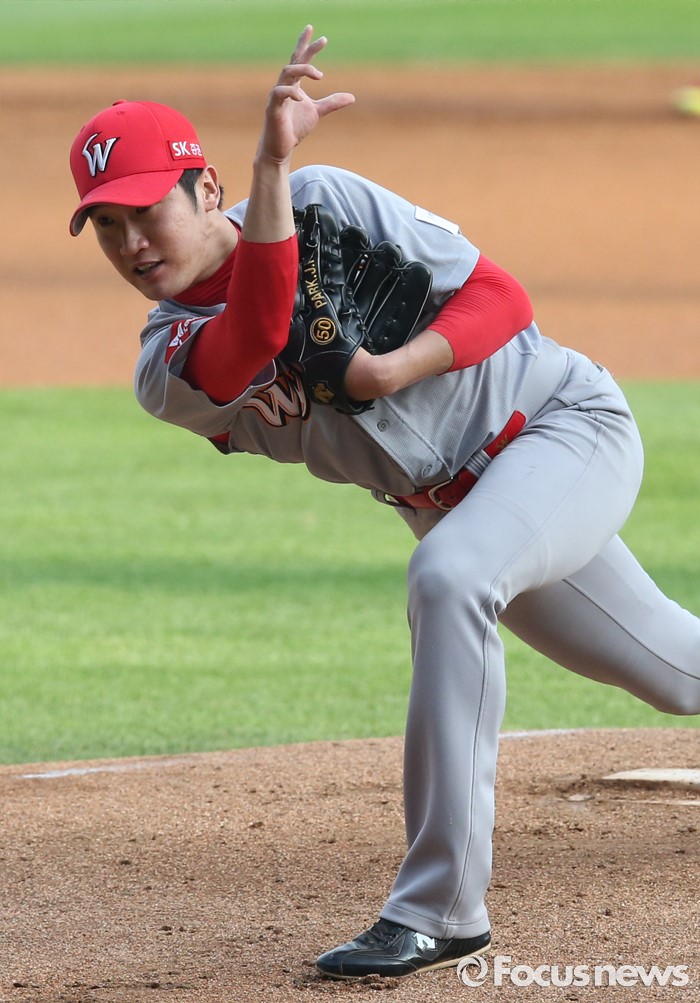 (서울=포커스뉴스) 3일 서울 잠실구장에서 열린 2016 프로야구 SK-LG 경기에서 1회말 SK 선발투수 박종훈이 투구하고 있다.