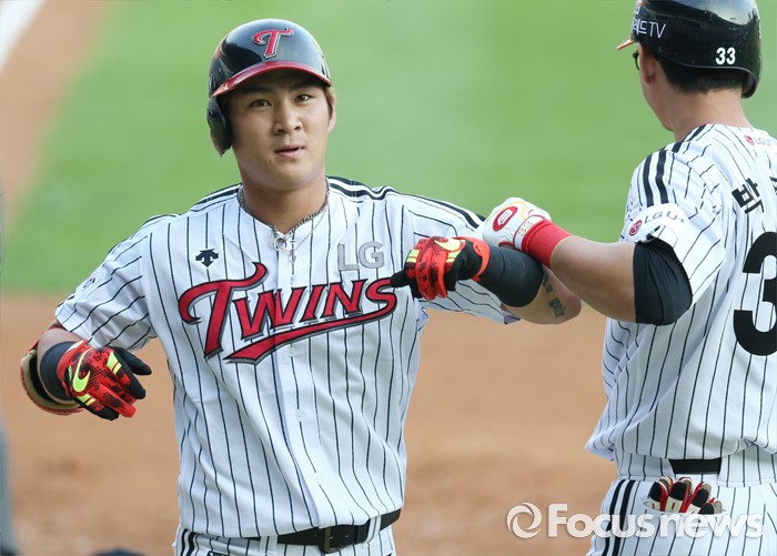 (서울=포커스뉴스) 3일 서울 잠실구장에서 열린 2016 프로야구 SK-LG 경기 2회말 2사후 LG 오지환이 우월 솔로 홈런을 치고 박용택의 환영을 받으며 홈인하고 있다.