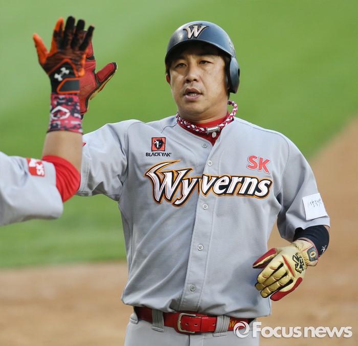 (서울=포커스뉴스) 3일 서울 잠실구장에서 열린 2016 프로야구 SK-LG 경기 4회초 2사 1,2루에서 SK 정의윤의 좌익수를 넘기는 2루타때1루주자 김강민이 홈인하고 있다.