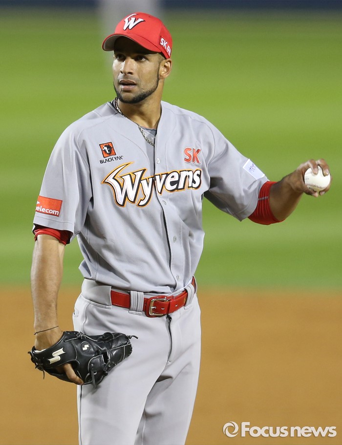 (서울=포커스뉴스) 3일 서울 잠실구장에서 열린 2016 프로야구 SK-LG 경기에서 SK 투수 라라가 6회말 구원등판해 마운드에서 포수의 사인을 살피고 있다.
