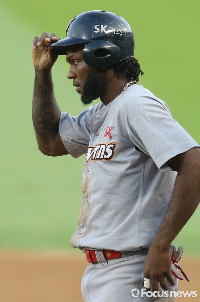 (서울=포커스뉴스) 3일 서울 잠실구장에서 열린 2016 프로야구 SK-LG 경기 4회초 1사 2루에서 SK 고메즈가 1타점 중전 안타를 치고 1루에서 헬맷을 고쳐 쓰고 있다.