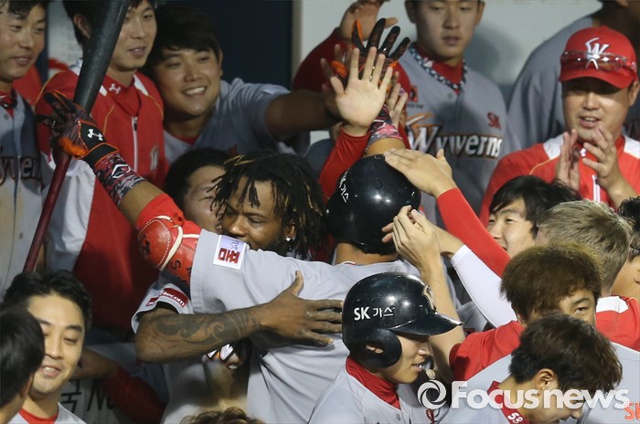 (서울=포커스뉴스) 3일 서울 잠실구장에서 열린 2016 프로야구 SK-LG 경기 8회초 1사 1루에서 SK 최승준이 우중월 2점 홈런을 치고 덕아웃에서 동료들의 열렬한 환영을 받고 있다.