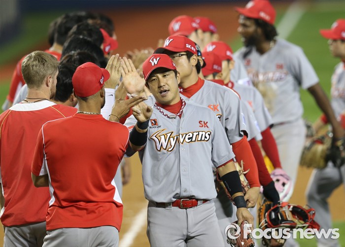 (서울=포커스뉴스) 3일 서울 잠실구장에서 열린 2016 프로야구 SK-LG 경기에서 승리한 SK 선수들이 하이파이브하고 있다.