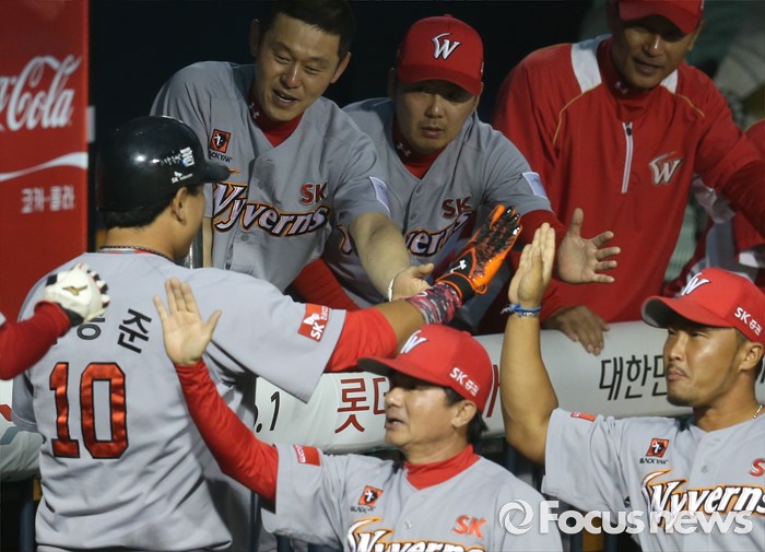 (서울=포커스뉴스) 3일 서울 잠실구장에서 열린 2016 프로야구 SK-LG 경기 8회초 1사 1루에서 SK 최승준이 우중월 2점 홈런을 치고 덕아웃에서 동료들의 열렬한 환영을 받고 있다.