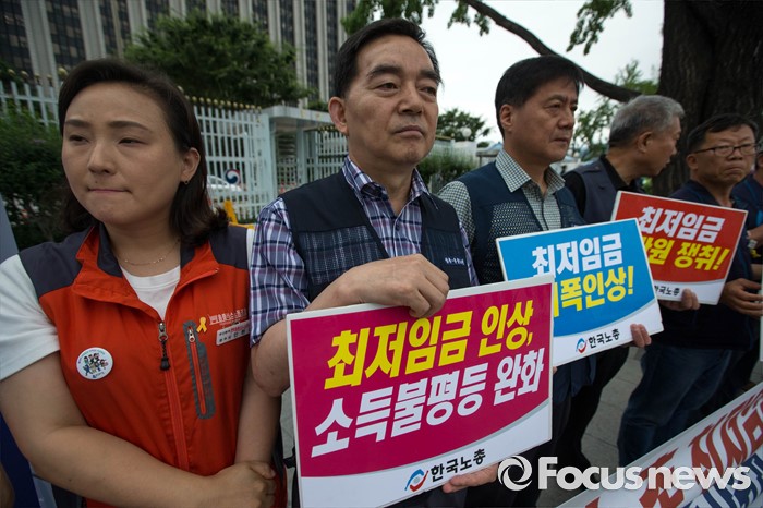 (서울=포커스뉴스) 4일 오전 서울 종로구 정부서울청사 앞에서 양대노총의 최저임금 대폭인상 및 노동자위원 중대 결단을 예고하는 기자회견이 열리고 있다.