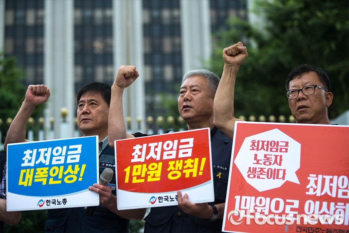 (서울=포커스뉴스) 4일 오전 서울 종로구 정부서울청사 앞에서 양대노총의 최저임금 대폭인상 및 노동자위원 중대 결단을 예고하는 기자회견이 열리고 있다.