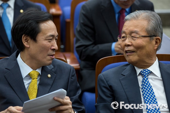(서울=포커스뉴스) 김종인(오른쪽) 더불어민주당 비상대책위 대표와 우상호 원내대표가 4일 오전 서울 여의도 국회에서 열린 의원총회에 참석해 대화 하고 있다.