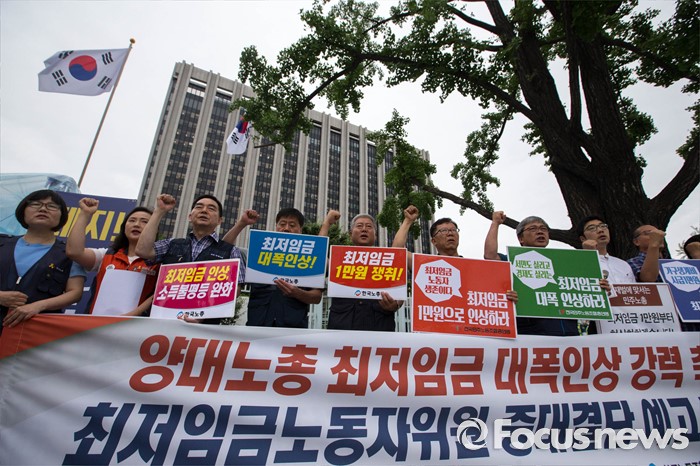 (서울=포커스뉴스) 4일 오전 서울 종로구 정부서울청사 앞에서 양대노총의 최저임금 대폭인상 및 노동자위원 중대 결단을 예고하는 기자회견이 열리고 있다.