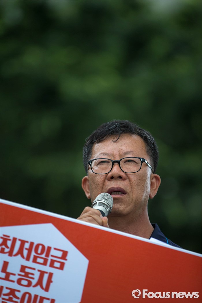 (서울=포커스뉴스) 4일 오전 서울 종로구 정부서울청사 앞에서 양대노총의 최저임금 대폭인상 및 노동자위원 중대 결단을 예고하는 기자회견이 열리고 있다.