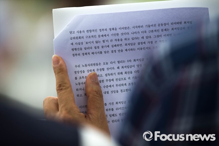 (서울=포커스뉴스) 4일 오전 서울 종로구 정부서울청사 앞에서 양대노총의 최저임금 대폭인상 및 노동자위원 중대 결단을 예고하는 기자회견이 열리고 있다.