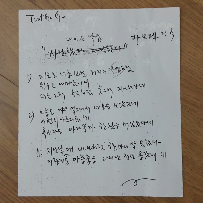 기형도 시인의 육필이 담긴 '내 마음 낙엽' 가사지에는 제목을 '사랑했다 사랑한다'라고 썼다가 두 줄로 긋고 위에 '내 마음 낙엽'이라고 쓴 흔적이 남아있다.