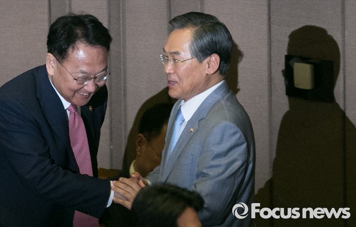 (서울=포커스뉴스) 4일 오전 서울 여의도 국회에서 열린 343회 국회(임시회) 6차 본회의, 경제에 관한 대정부 질문에 참석한 유일호(왼쪽) 경제부총리 겸 기획재정부 장관과 우윤근 국회 사무총장이 인사하고 있다.