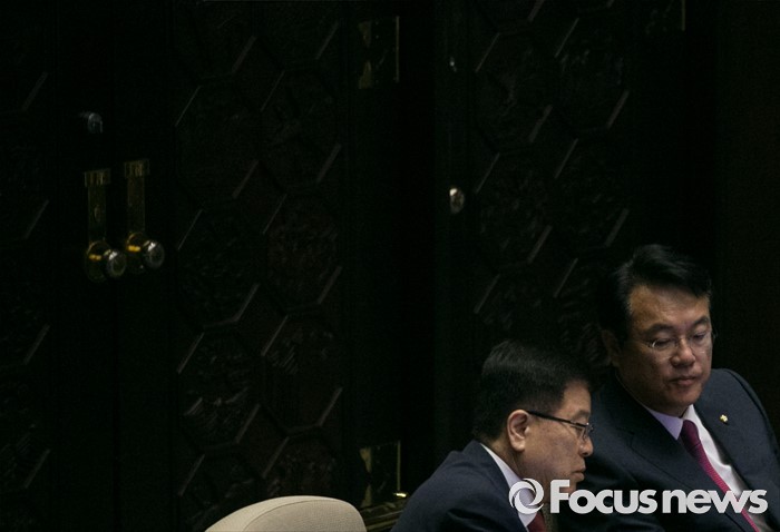 (서울=포커스뉴스) 4일 오전 서울 여의도 국회에서 열린 343회 국회(임시회) 6차 본회의, 경제에 관한 대정부 질문에 참석한 정진석(오른쪽) 새누리당 원내대표와 김광림 정책위의장이 대화하고 있다.