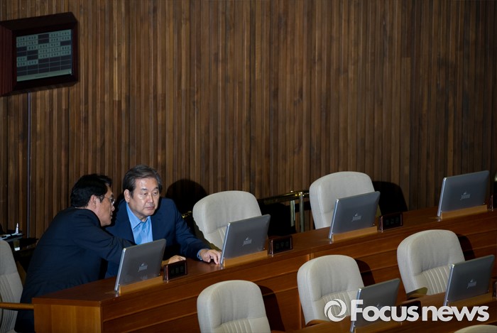 (서울=포커스뉴스) 4일 오전 서울 여의도 국회에서 열린 343회 국회(임시회) 6차 본회의, 경제에 관한 대정부 질문에 참석한 정진석(왼쪽) 새누리당 원내대표와 김무성 전 대표가 대화하고 있다.