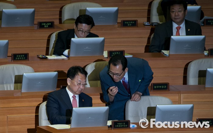 (서울=포커스뉴스) 4일 오전 서울 여의도 국회에서 열린 343회 국회(임시회) 6차 본회의, 경제에 관한 대정부 질문에 참석한 유일호 경제부총리 겸 기획재정부 장관이 관계자와 대화하고 있다.