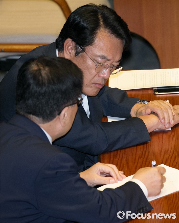 (서울=포커스뉴스) 4일 오전 서울 여의도 국회에서 열린 343회 국회(임시회) 6차 본회의, 경제에 관한 대정부 질문에 참석한 정진석 새누리당 원내대표와 김광림 정책위의장이 대화하고 있다.