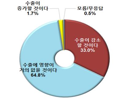 이에 따르면, 영국의 EU 탈퇴 후 중소기업 수출 전망은 "수출에 미치는 영향이 거의 없을 것"이라는 응답이 64.8%로 우세했다. 그럼에도 중소기업의 33.3%는 "수출이 감소할 것"으로 전망했다.
