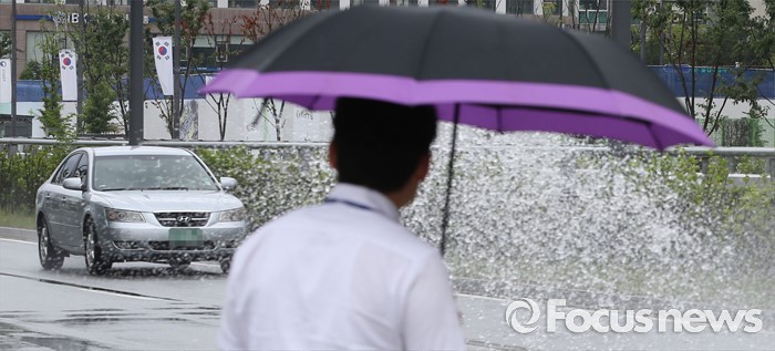 (세종=포커스뉴스) 충청 및 중부지역에 호우경보가 내려진 4일 세종시 정부세종2청사 국세청 앞에서 차량들이 물살을 가르며 지나고 있다.